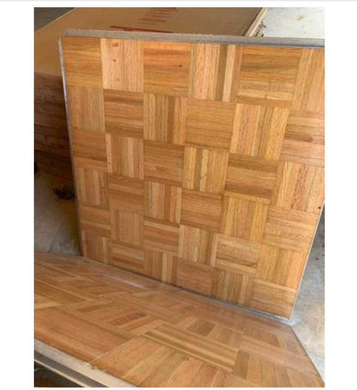 3 dance floor panels. Each panel is 3ft x 3ft and 1 inch thick. Each panel weighs 40 pounds.