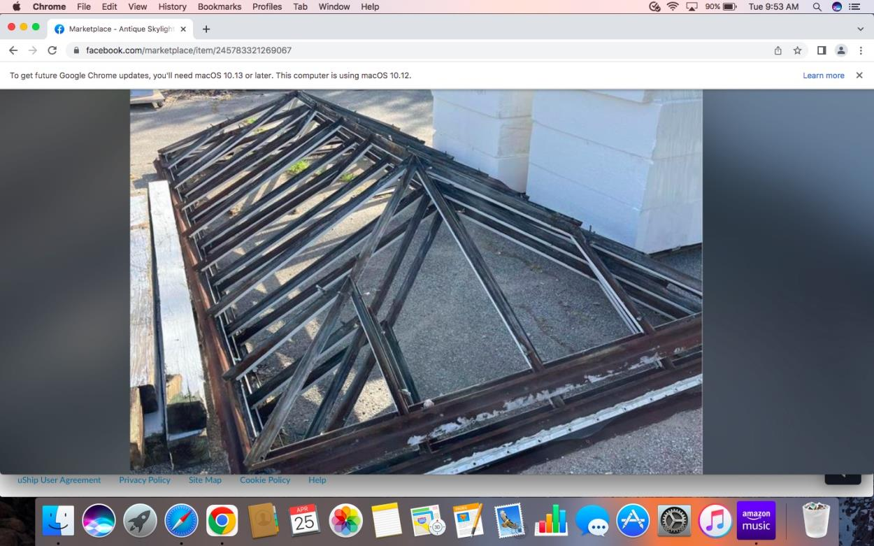 Antique skylight frames. Unsure of actual weight but told not very heavy. Loading help may not be available depending on pickup day or time. Unloading on Saturday or Sunday no problem. No glass involved.