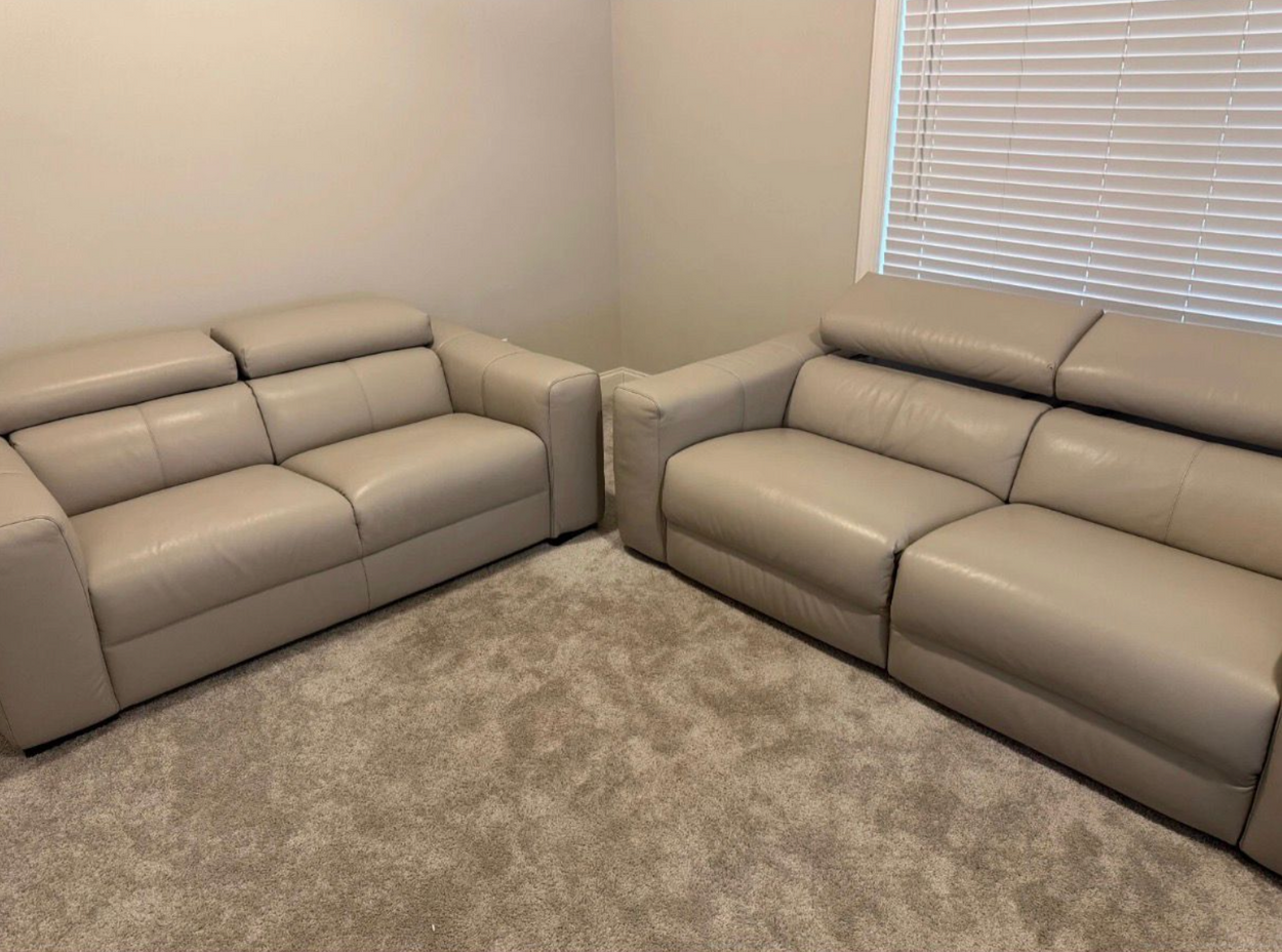 Two people to carry the sofa and loveseat. Delivery only between 9am and 4pm, and weekdays.