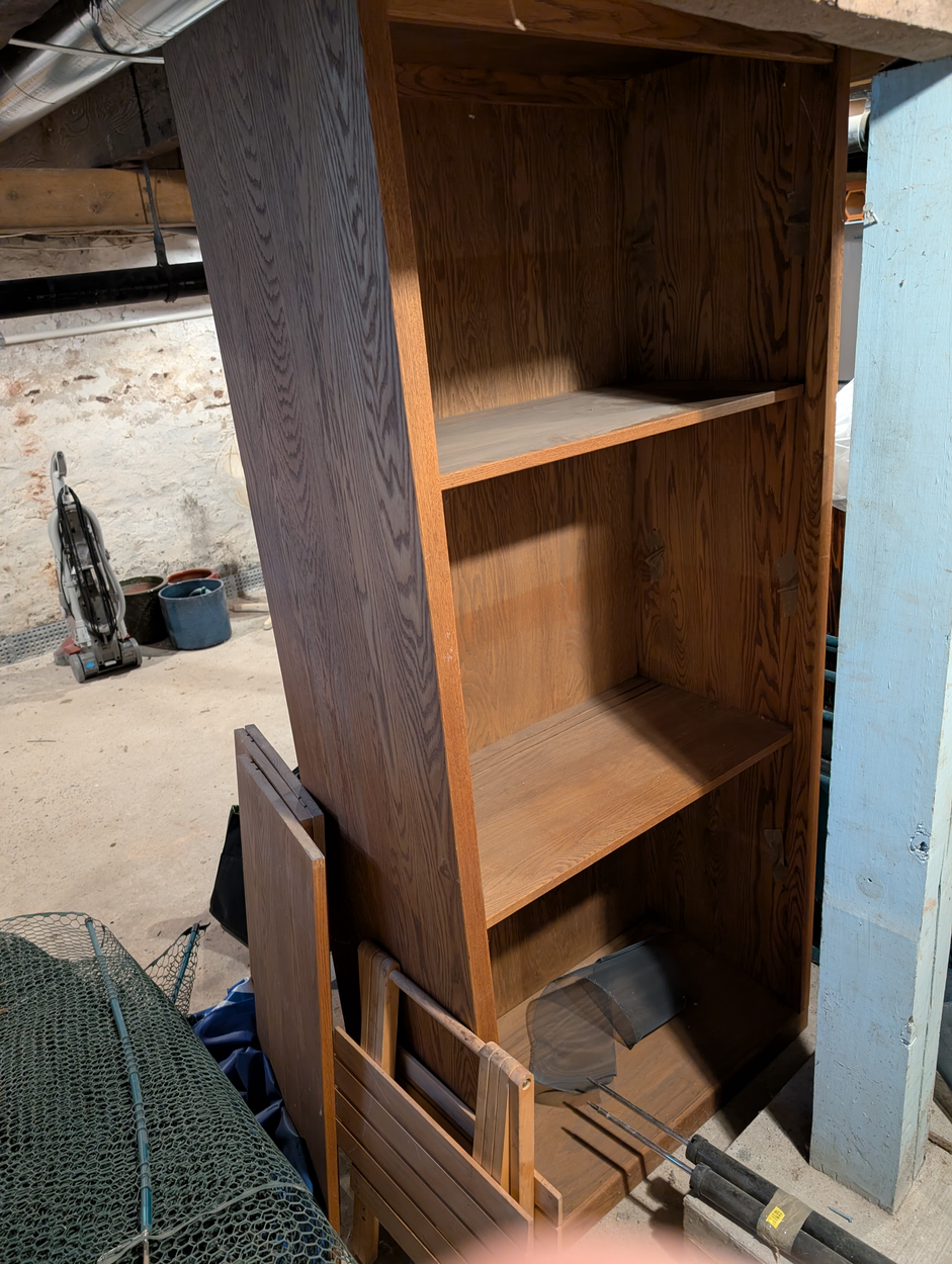 On the NJ side' the bookcase has to be carried up from the basement to the outside of the house. On the delivery side it has to be carried down an outside set of shallow stairs (not steep, wide and deep treads) through a set of glass sliding doors and a short distance into the family room where it will reside