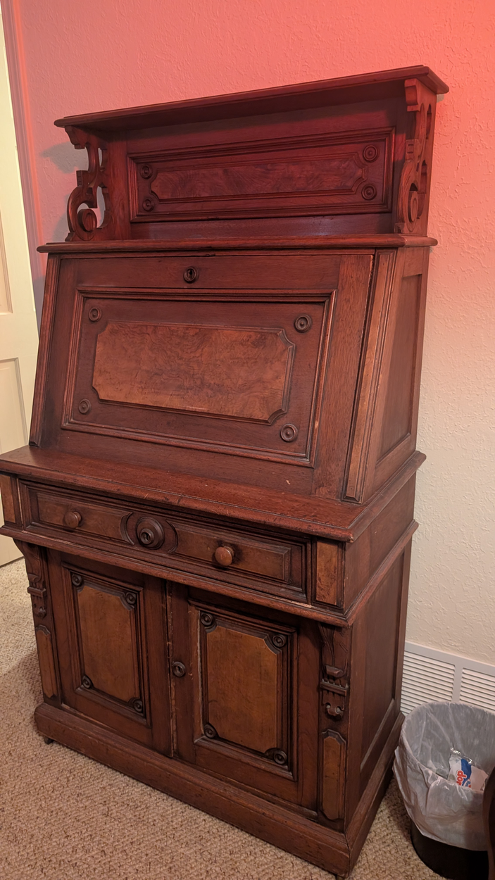 Secretary breaks down into top and bottom halves, drawers are detachable. Neighborhood in Santa Fe restricts vehicle size - vans and smaller trucks preferred.
