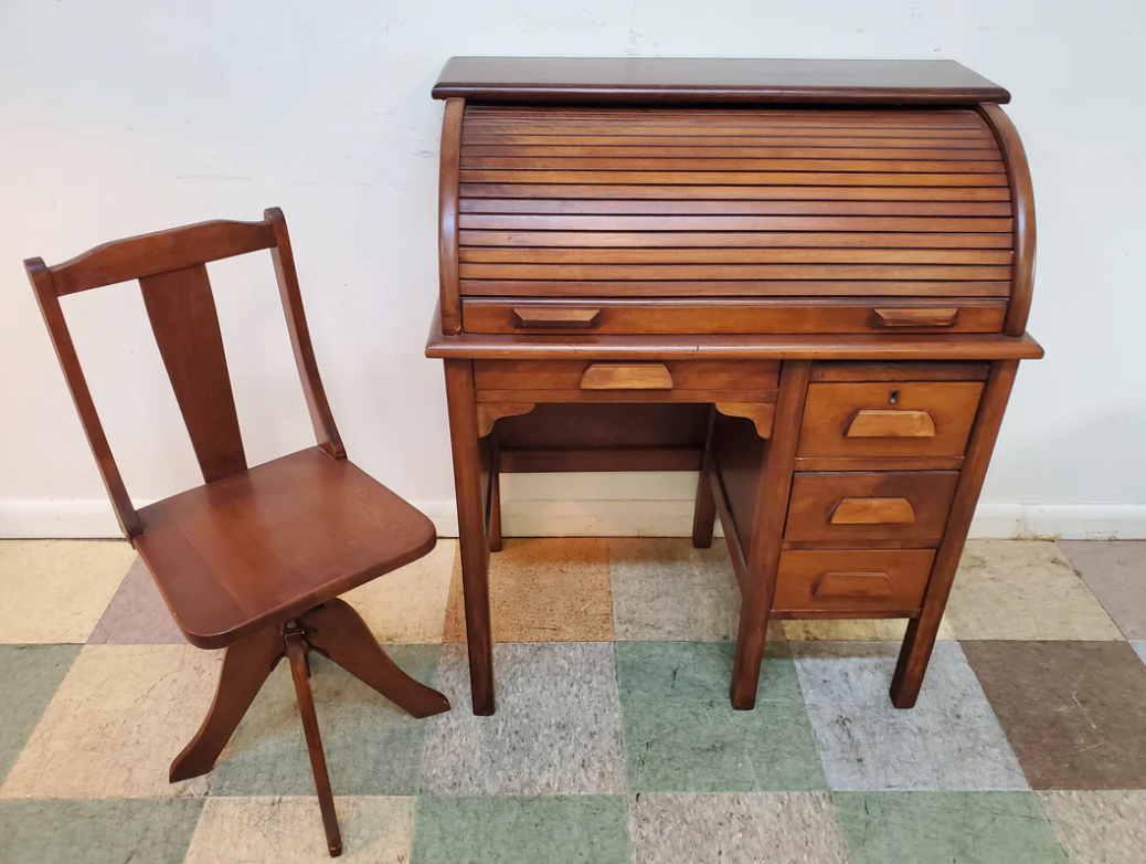 Includes small chair. Child-size desk and chair.