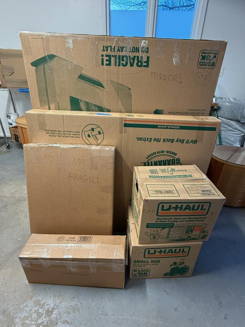 - estimate 2-3 U-Haul cardboard boxes (medium and large)