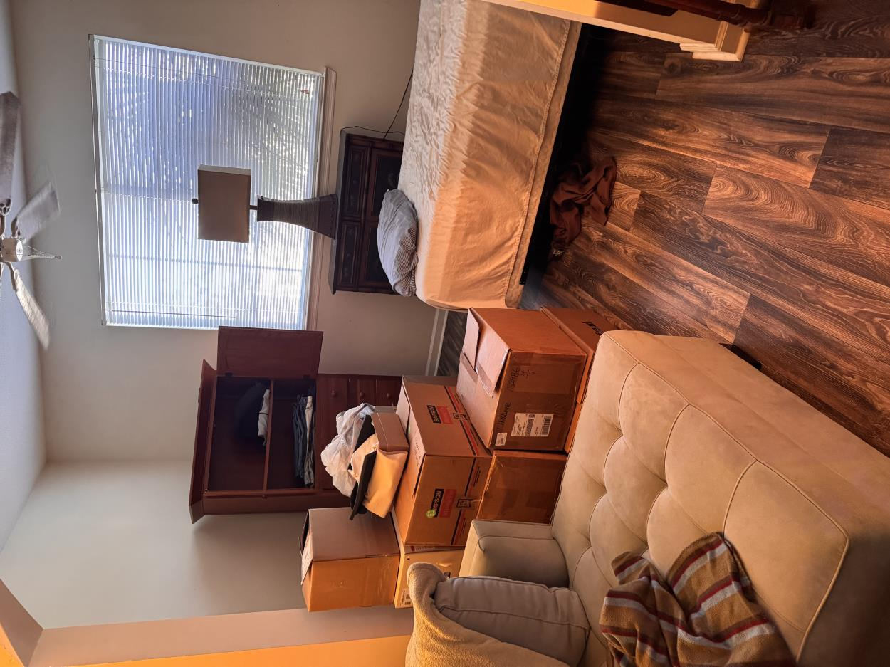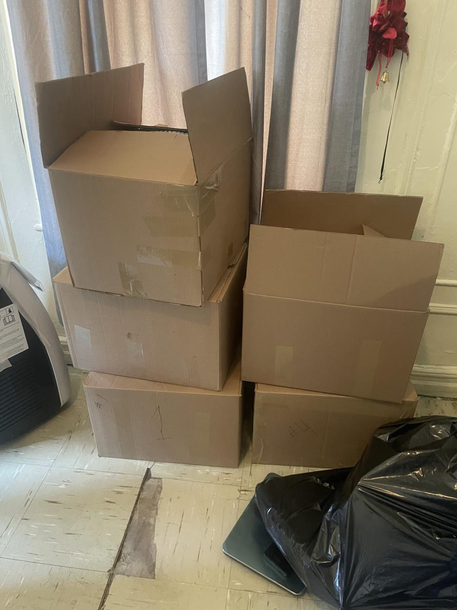 Household items: 13–16 boxes, mattress, bench, 2 rugs.