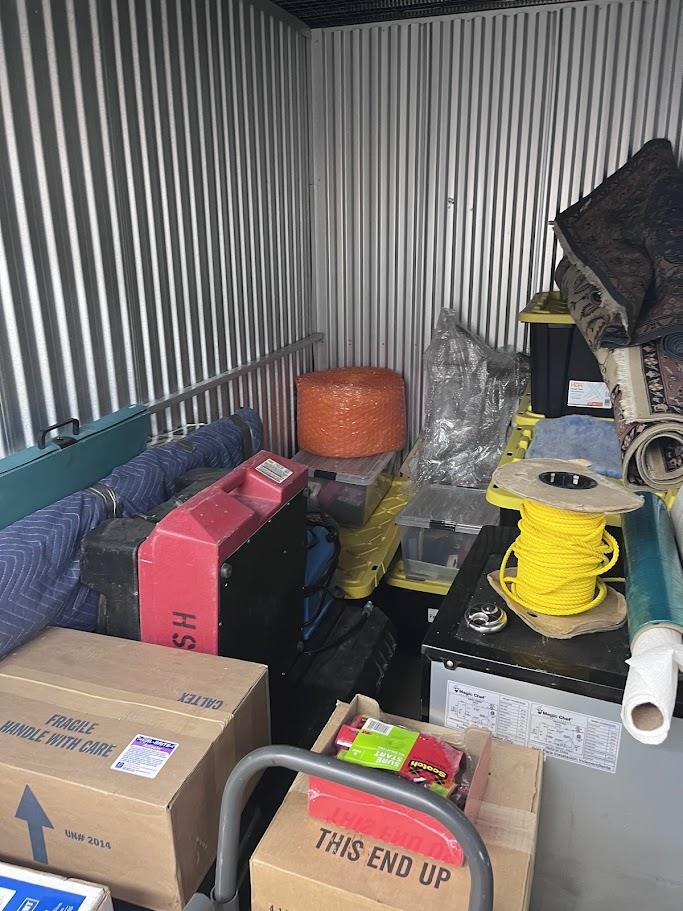 This is a 15'X5' storage unit. It is about 1/3 full of bins and miscellaneous office fixtures.