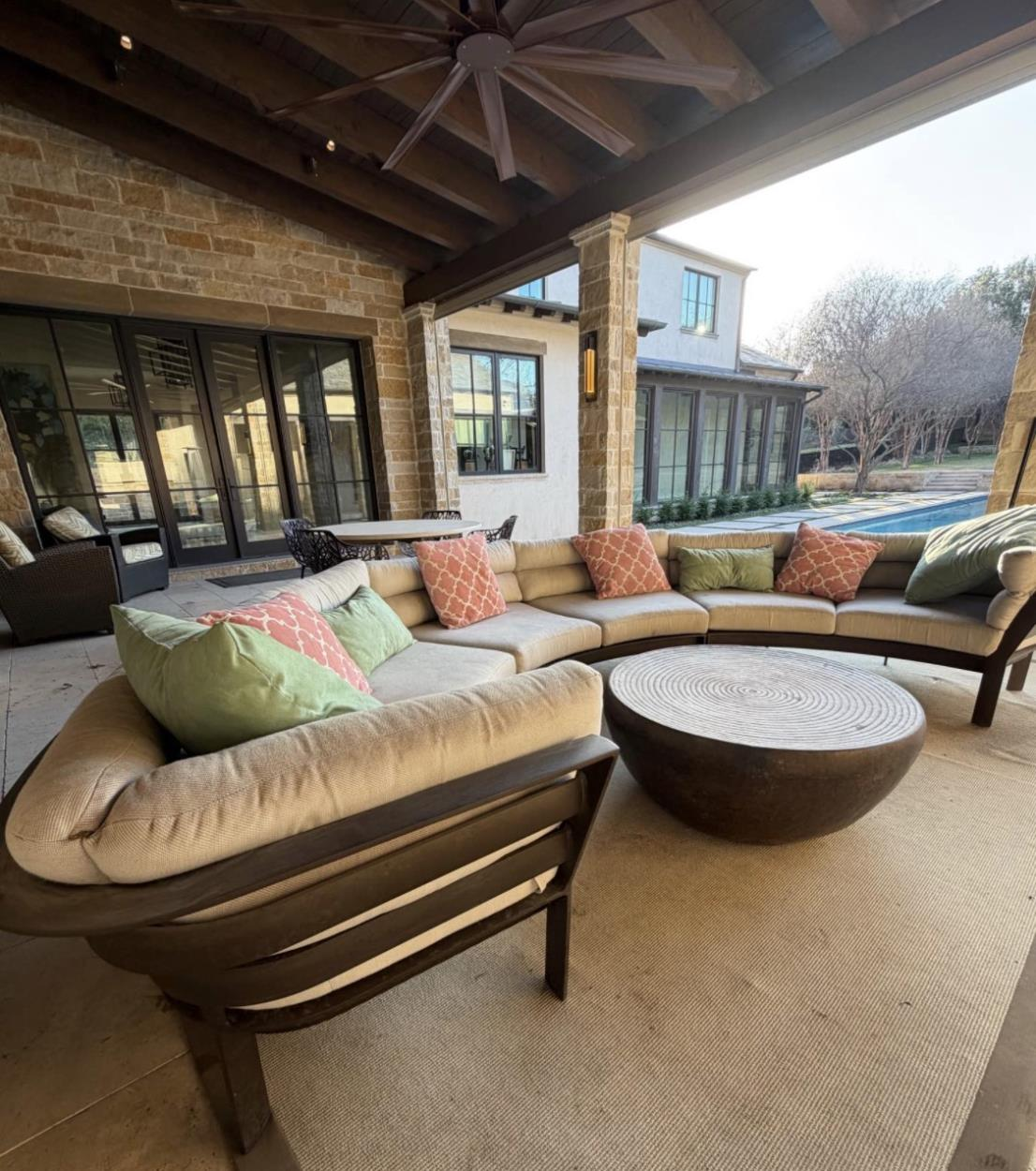 Circular couch breaks down into 3 pieces, table, 2 chairs, rug and 2 tower heaters.
