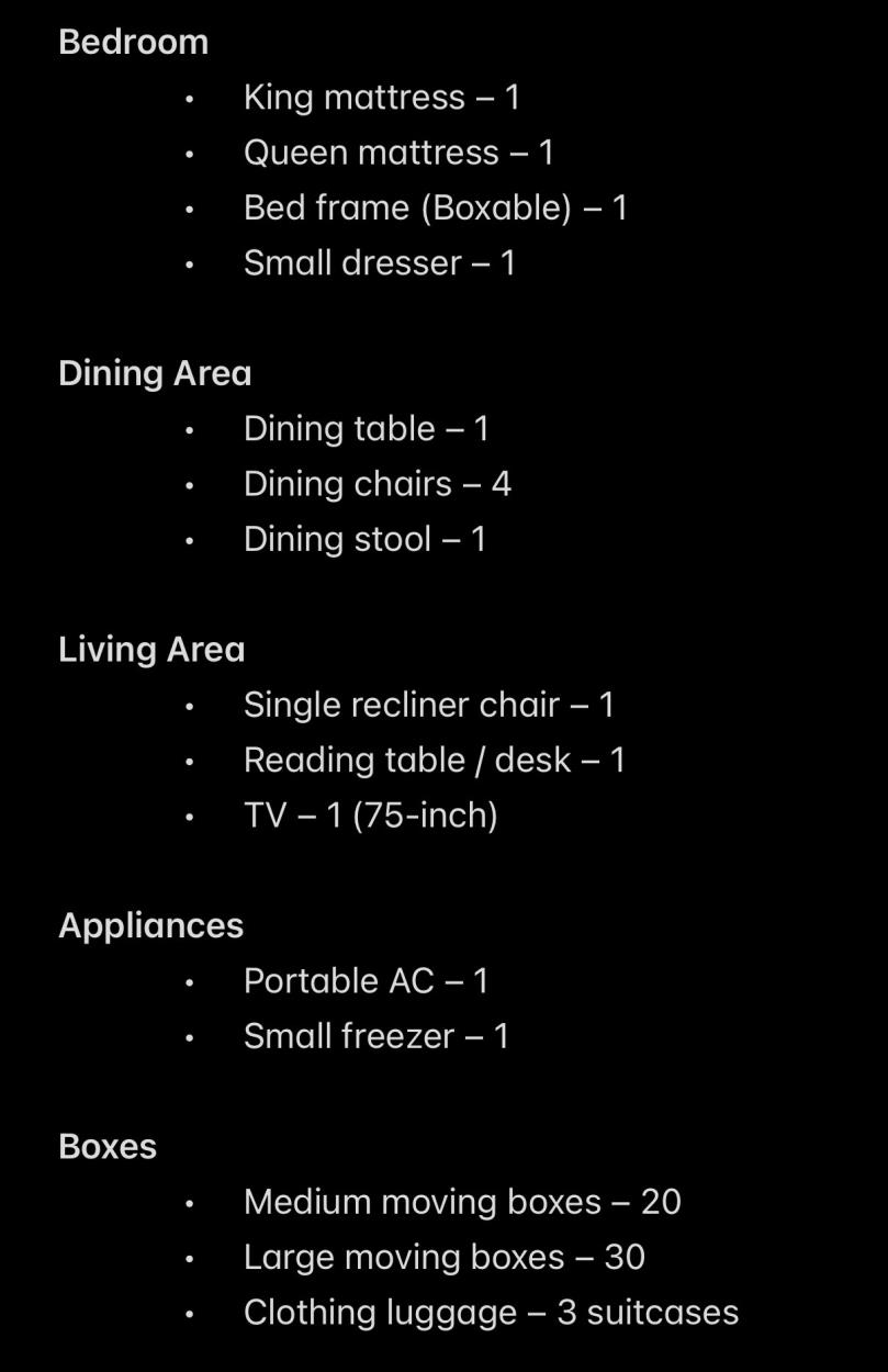 Inventory includes:• King mattress (wrapped)• Queen mattress (wrapped)• Bed frame (boxable)• Dining table + 4 chairs + 1 stool• Recliner chair• Reading desk• 75-inch TV (boxed/protected)• Portable AC (boxed)• Small freezer (boxed)• 15–18 medium boxes• 8–10 large boxes• 6–7 suitcases