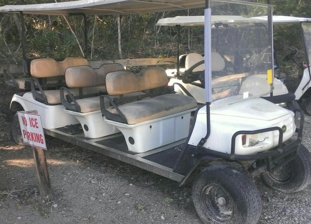 These carts will need to Scheduled with the Ferry system for delivery form Bald head Island .They will fit side by side on a 102 wide open trailer.1 cart runs the other does not