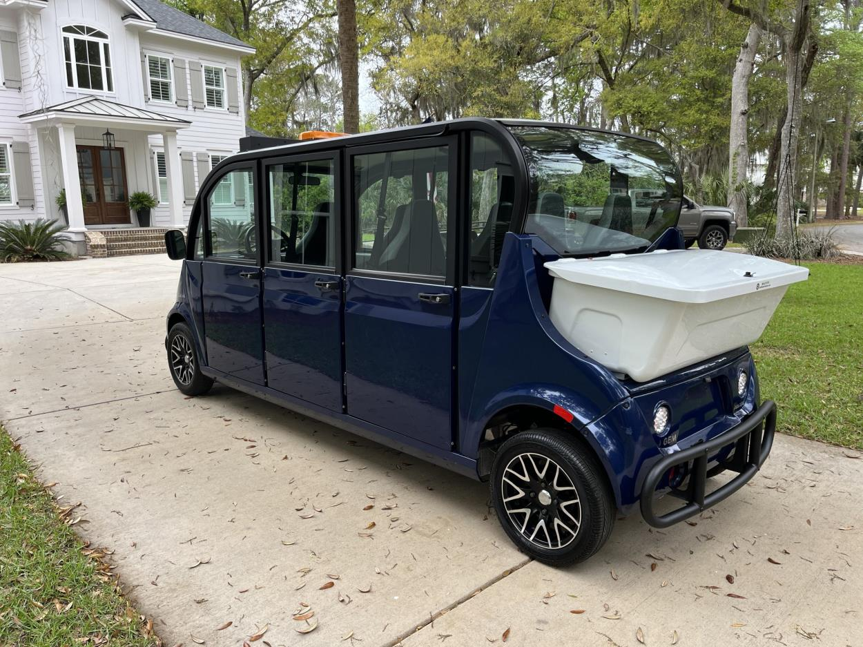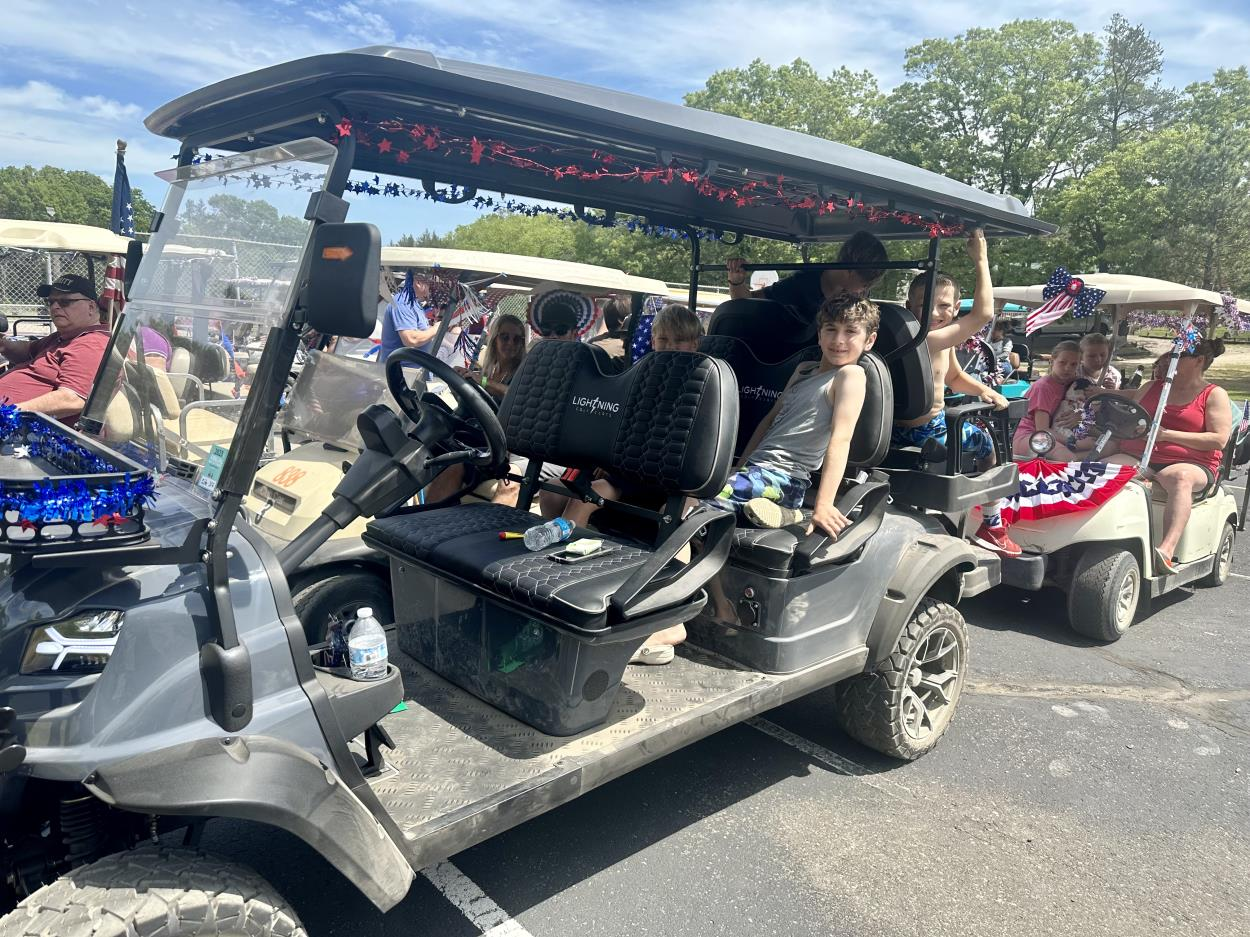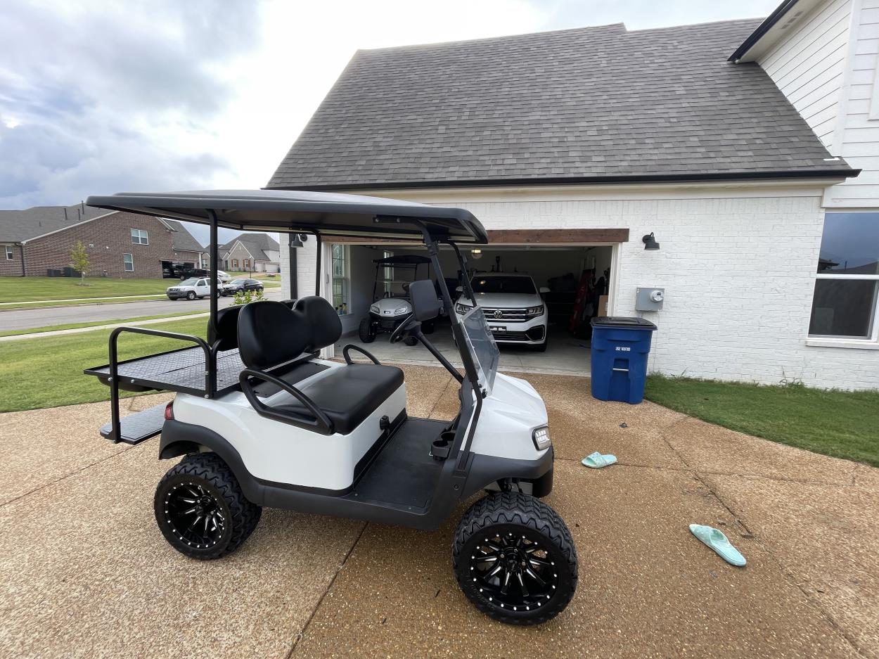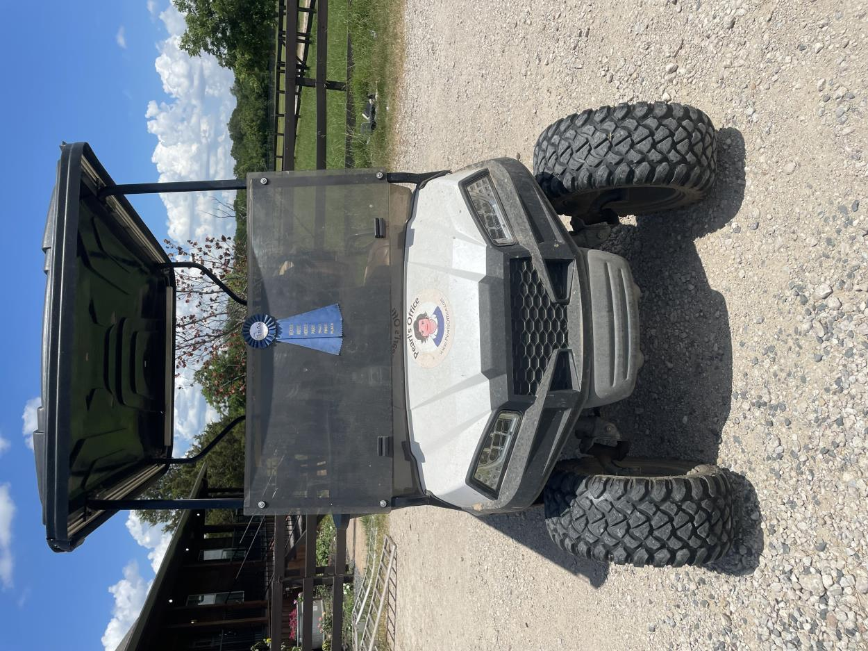 2 golf carts, 1 lawn mower