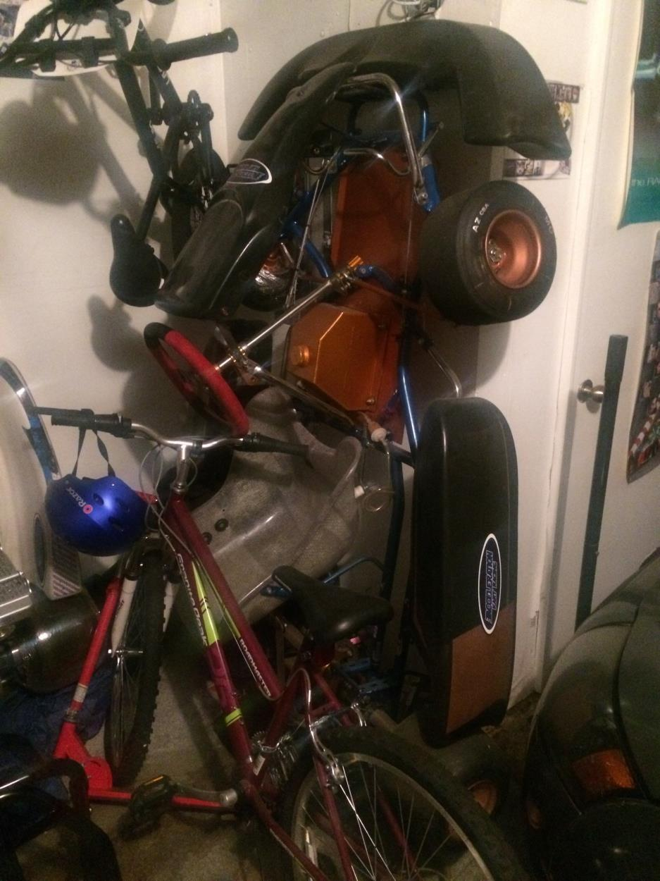Kid Kart as seen in photo, 10 tires and wheels and one rubber medium sized rubber maid container of parts