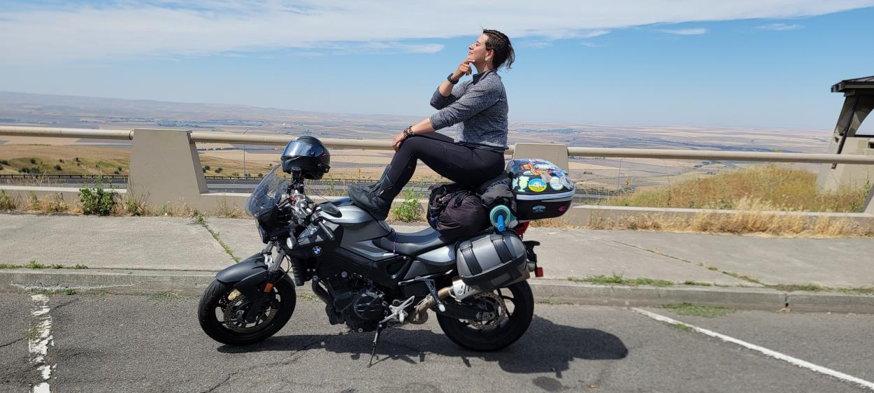 The bike is at a cargo logistics company in Orlando. There is a blue duffel bag that also goes with the motorcycle