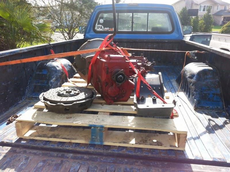 The parts consist of a IH 5 speed transmission with attached bell housing, NP205 transfer case, bracket, clutch, pressure plate, and jack shaft (very short drive shaft).