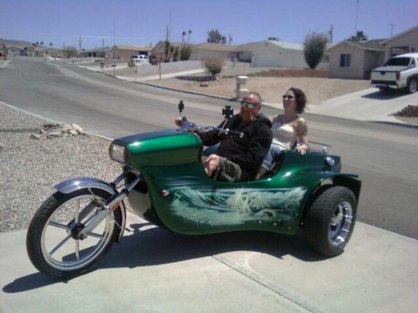 This Trike is made from the front end of a motorcyle and the back end of a VW bug. I am not sure of the weight. But my best guess is between 800 to 1000 lbs.