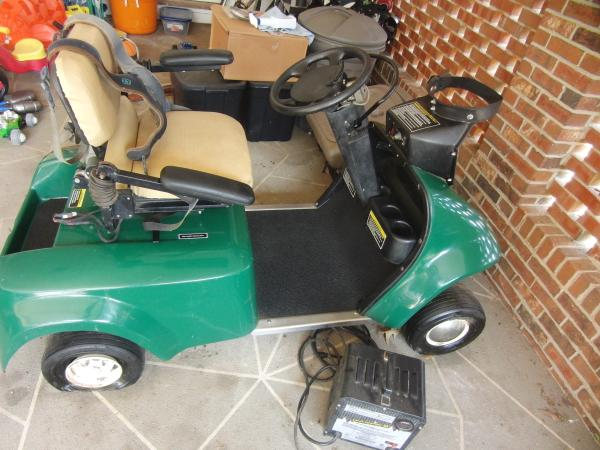 Single rider golf cart. Battery is dead but help is available for loading. Once loaded, lock the manual hill brake and secure the vehicle to the trailer.