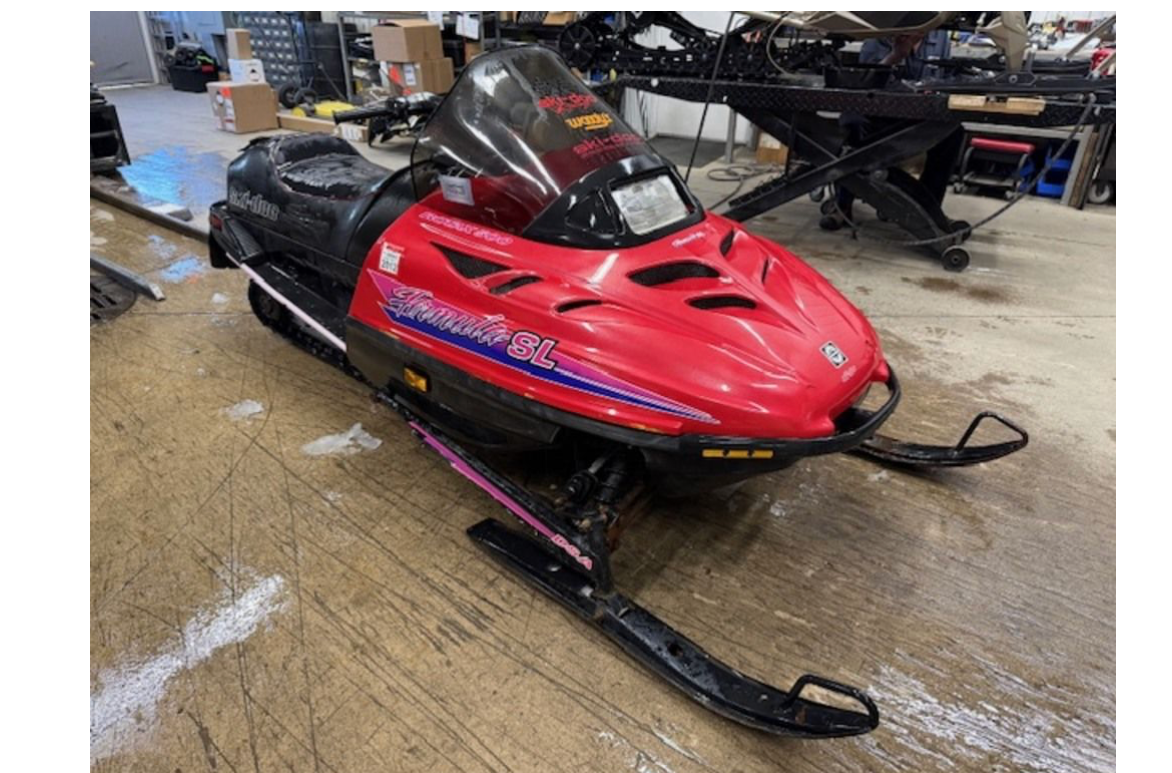 SNOWMOBLIE IS ON A CRATE BOTTOM FOR EASY ON AND OFF TRAILERS.