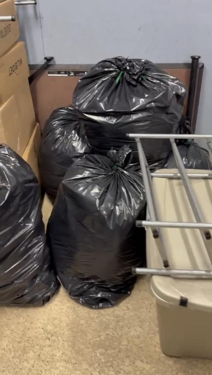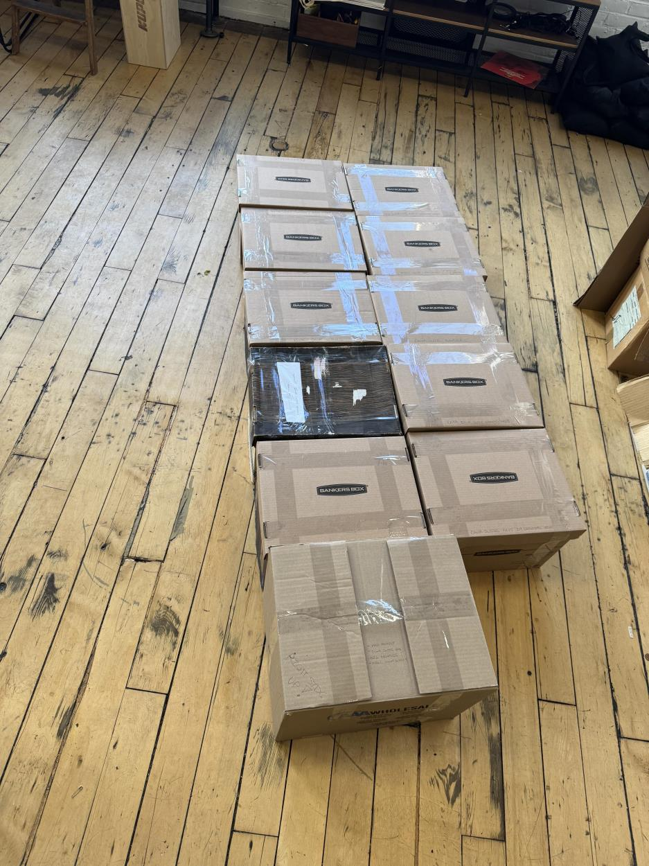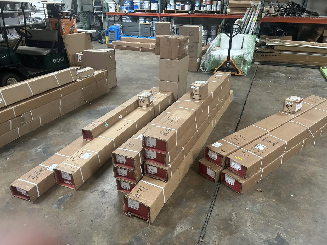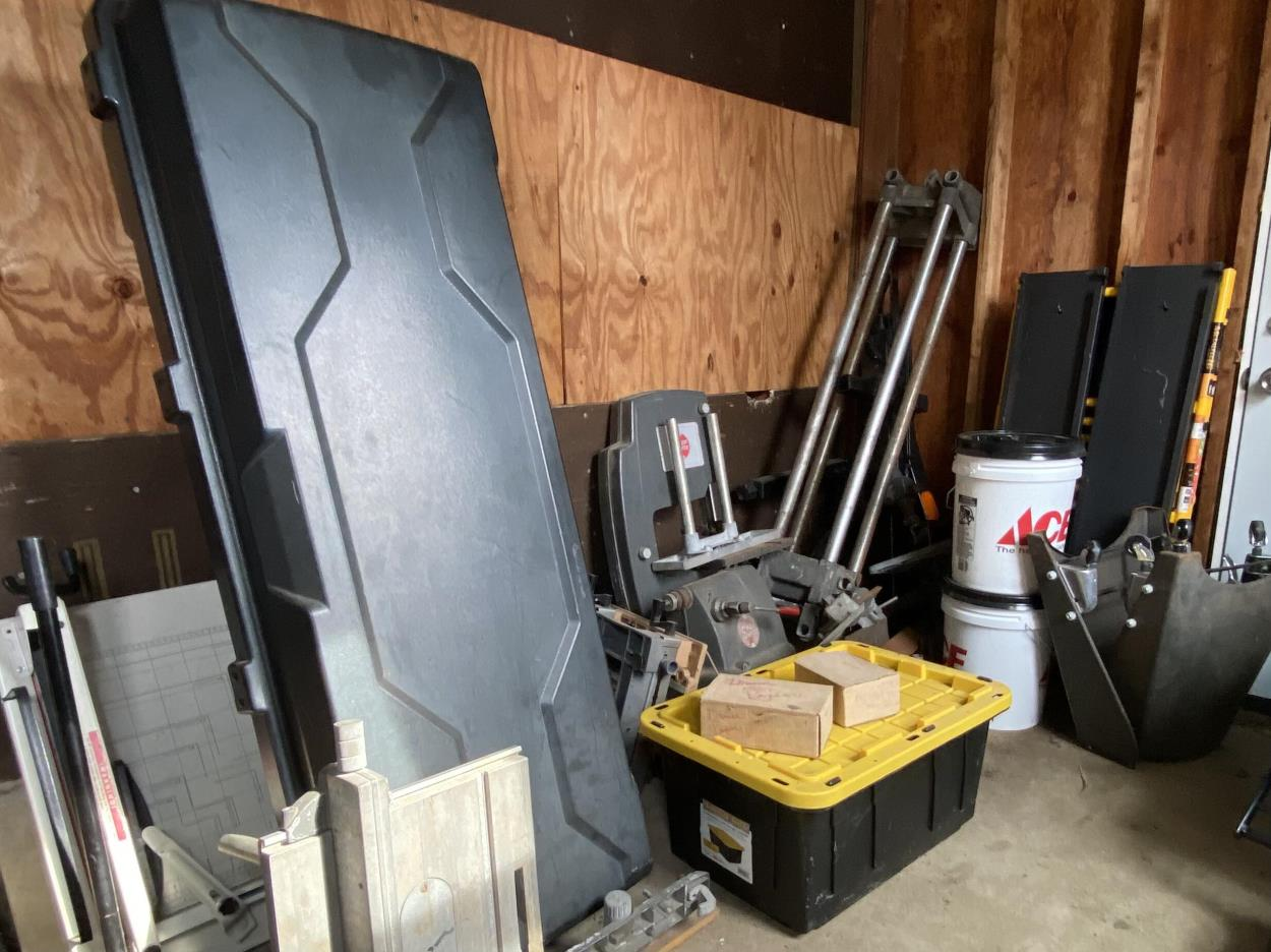 There is only one storage bin and two buckets in the shipment, everything else is loose items, a dismantled Shop Smith Mak5 workstation, a Yakima Gearbox and its parts (mounting parts), a book guillotine (watch your fingers), and a personal scaffolding folded into itself. There might be smaller parts that are not visible on the photo (I am in Texas and items are in Delaware, photo taken by family members). Research tells me shipment will likely be around 400 to 500 pounds all together. Not sure how accurate that estimate is.