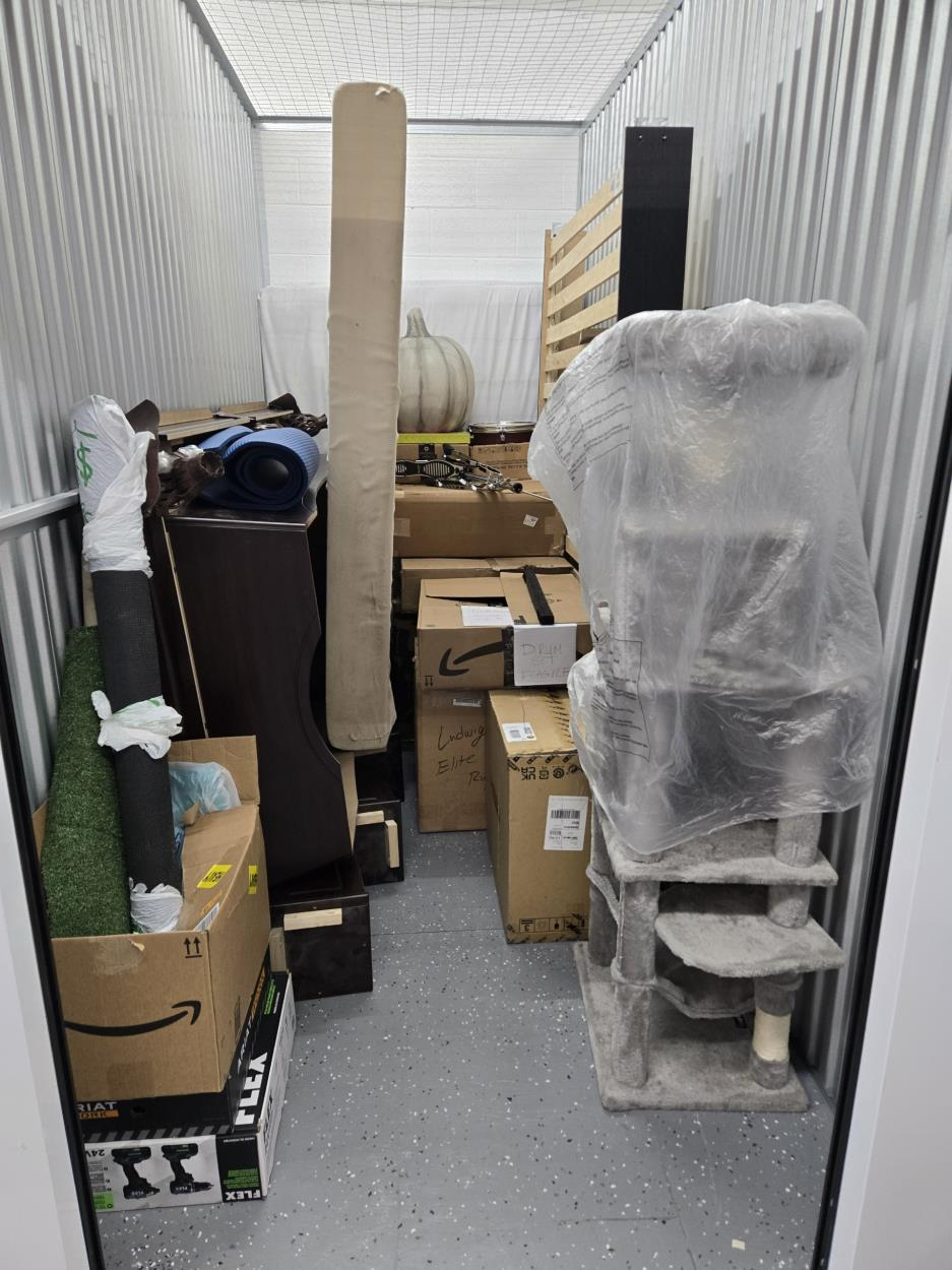Bed, drum set and miscellaneous items in 5x8 storage unit.