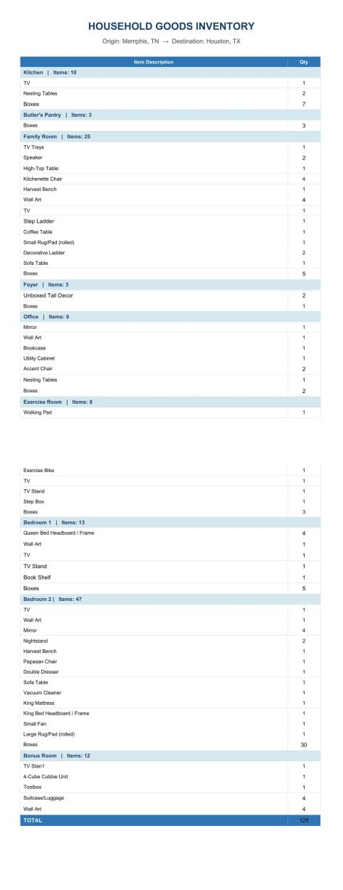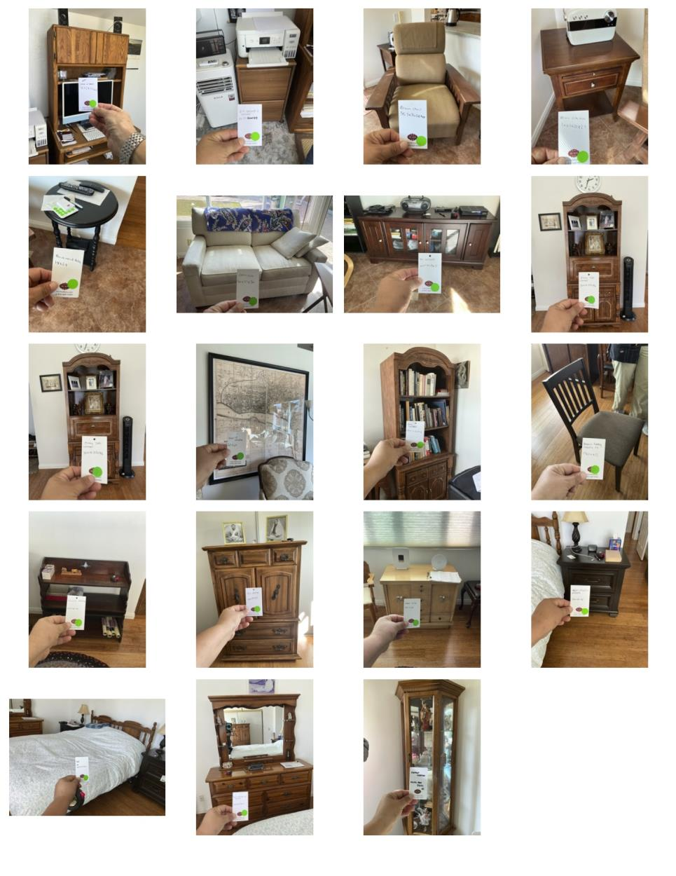 Small tall desk, 2 tall bookcases, sofa, credenza, 3 x chest of draw units, corner glass cabinet, arm chair, large piece of art 5' x 5', 7 smaller sidetables, closet boxes x 4, small boxes x 12 ... please refer to picture for most of the furniture items to be moved.