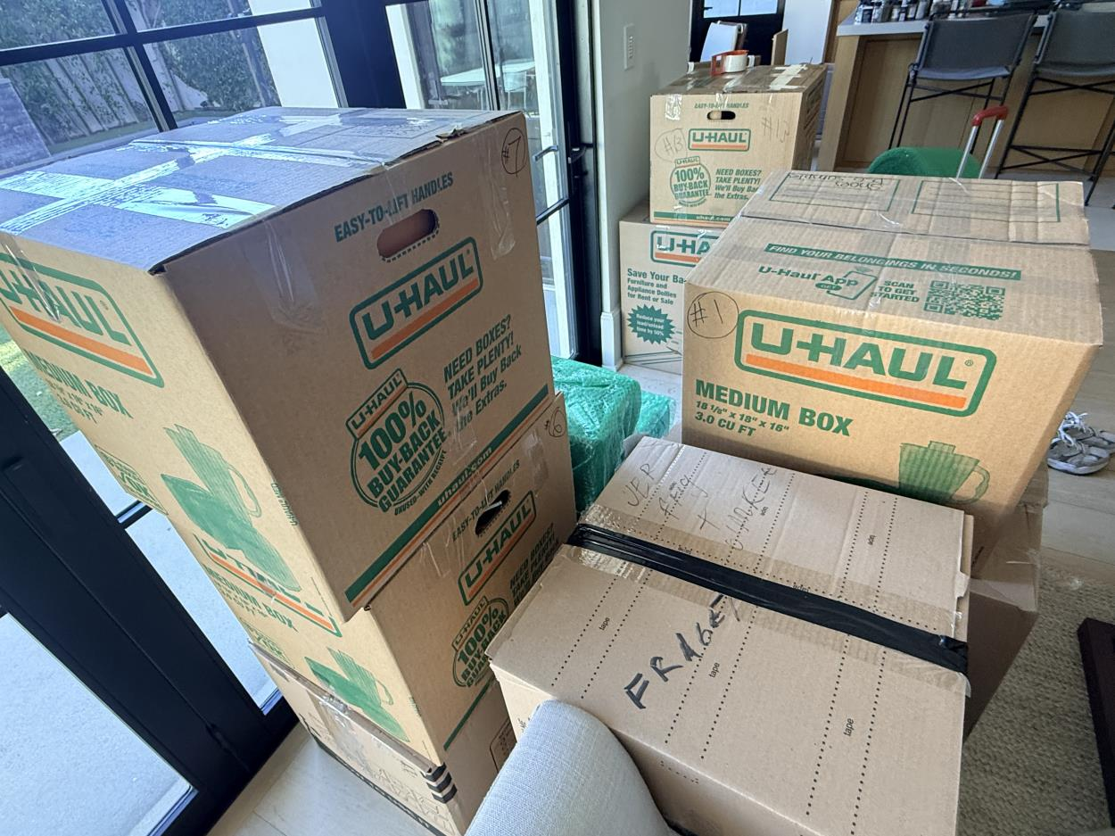 All items are packed and secured. Ready to go. Will be outside for pickup. We can load.