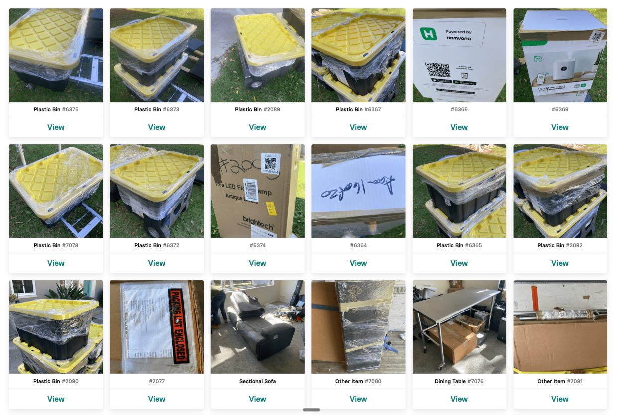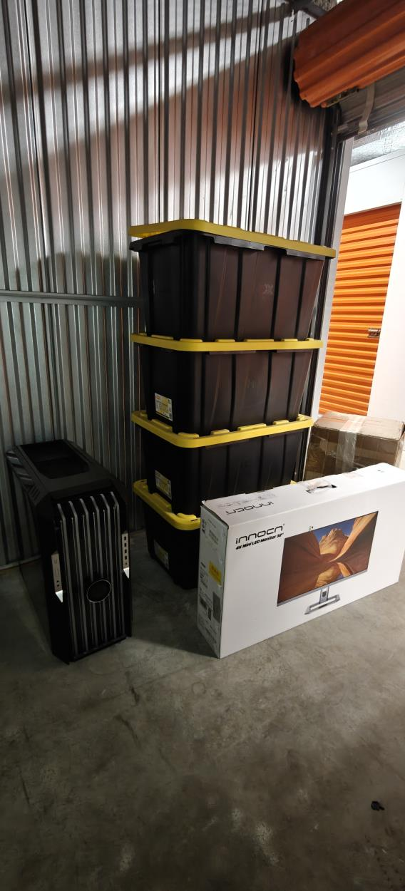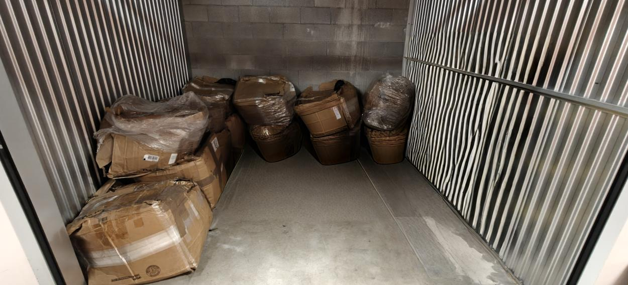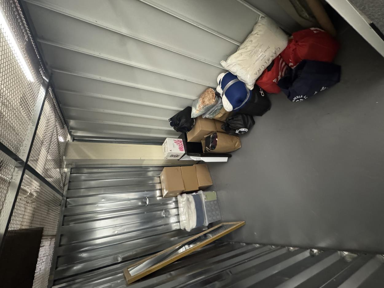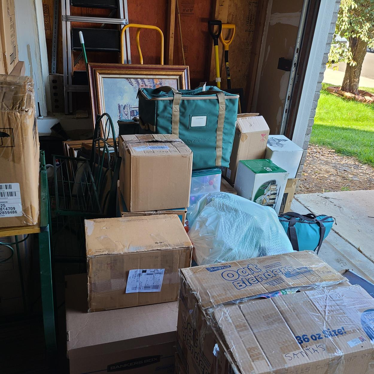 This is a 10' by 10' room filled primarily with storage bins and a handful of household goods in boxes. There are approximately 100 storage bins with household goods. Elevator is available at the pickup location (storage facility). Items will be delivered to a residential garage.
