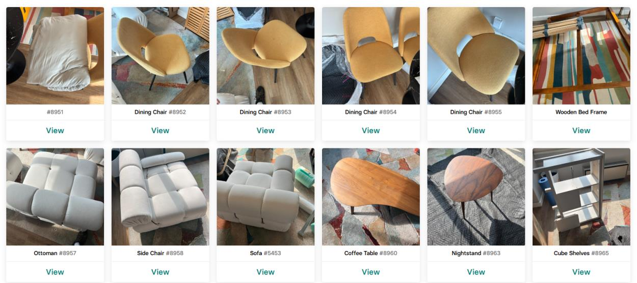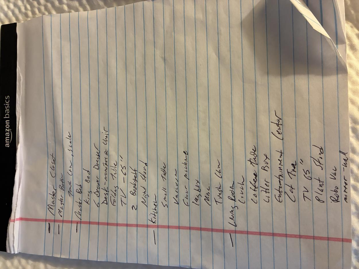Only the washer and dryer are upstairs at the pickup. all other items are staged in the garage and living room. A complete list of every single item is included in the pictures. Delivery needs to be 3 days after pickup, or after 6 PM on weekdays if before 3 days, or any time on Sat/Sun. Everything fits in a space 8’ x 16’ x 6’6”. Needs about 835 cubic feet.