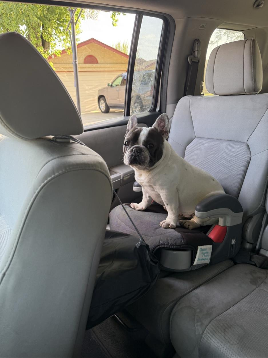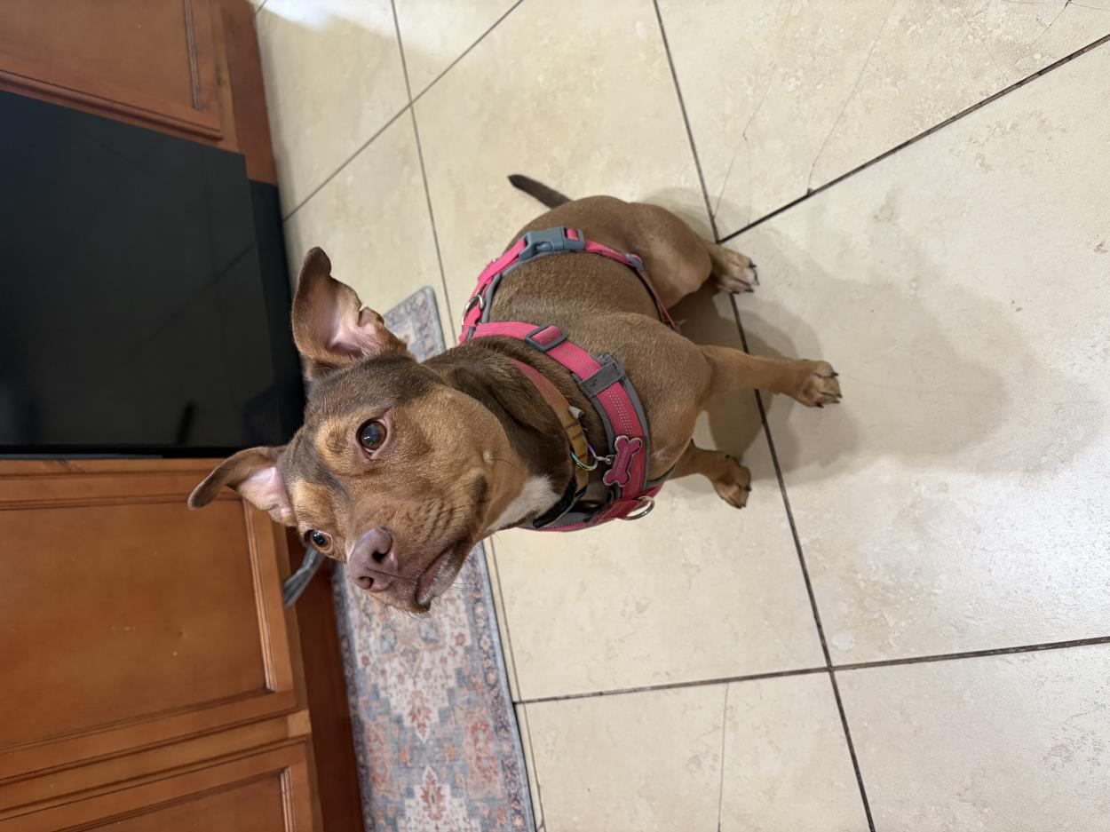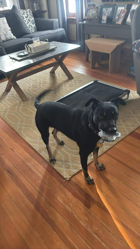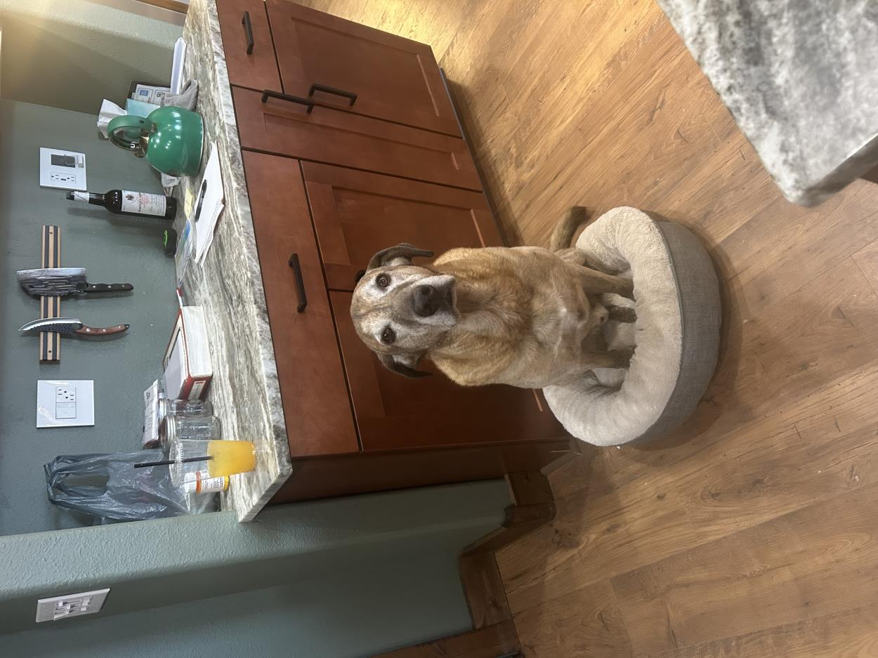 Super friendly. Will travel with crate, blanket, food, leash and anything else necessary.