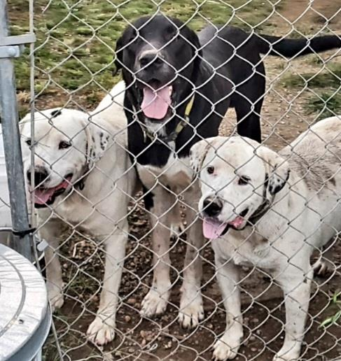 3 farm dogs riding in crates. Black Dog is Great Pyrenees and Dane mixed. White dogs are Bulldog/ Great Pyrenees and Newfoundland.