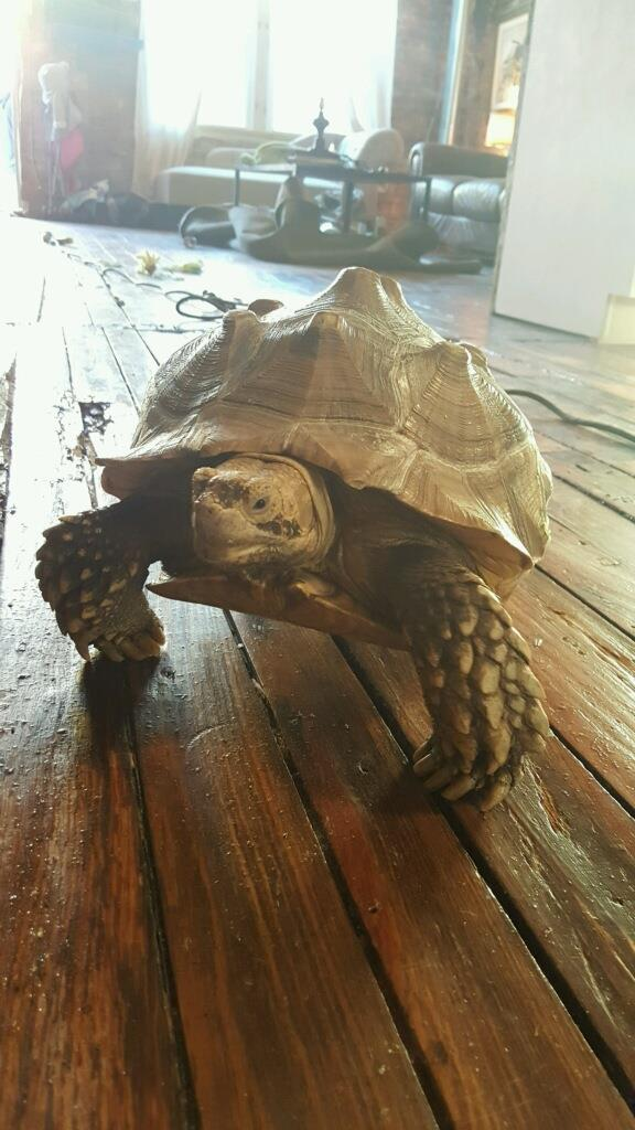Peggie is a sweet 20lb Sulcata Tortious..she is quiet & calm..