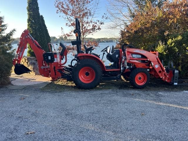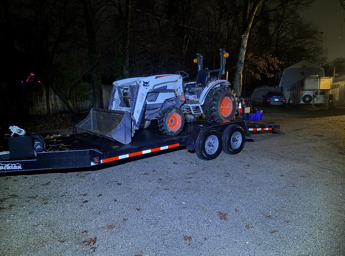 The tractor has a loader and a backhoe attached. There will also be a Baumalite flail mower on the trailer. A set of pallet forks and the loader bucket will need to go in the back of your truck due to space on the trailer. The load weight is about 7K.