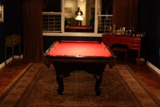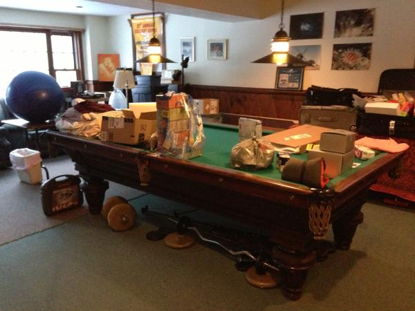 Pool table is already disassembled. It's down a flight of stairs in the basement (easily accessible). If there's room, we'll also ship the rug for underneath it. We may have an extra set of hands available to help load into the car. Pool table is going to the Hasty Pudding Clubhouse; we'd be happy to show you our around.