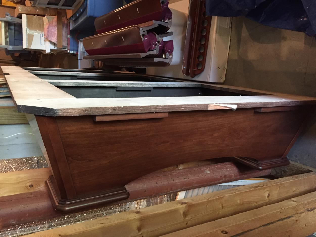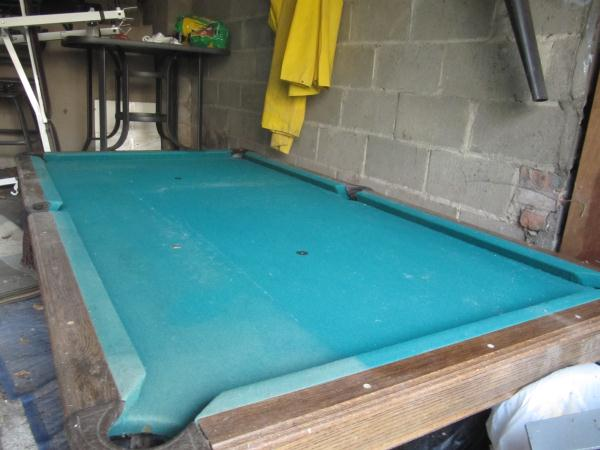 2 legs, 2 long side rails and 2 short end rails. 1 box 7'x 1' containing pool cues, felt, cups, and billiard balls. Need to be wrapped and placed on pallet.