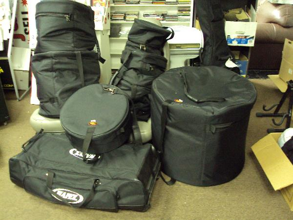 Measurements and weight are approximate. I measured the set in cases (as pictured). Everything to be shipped is pictured in Black Soft Cases. (Except for the Guitar that I just noticed in the background!)