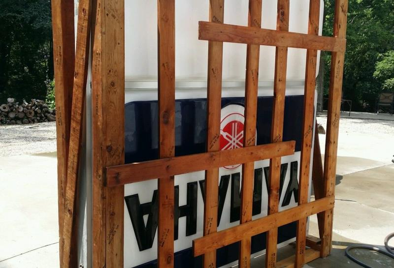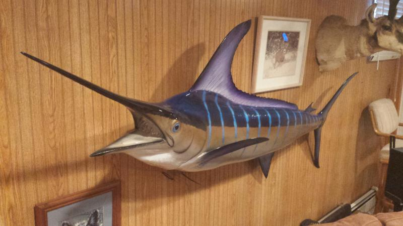 Both are curved so measurements might be a little off. Can crate or heavily bubble wrap but no weight can be put on the mounts. Fin on the sale fish comes off, Marlin is one piece.