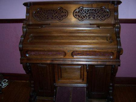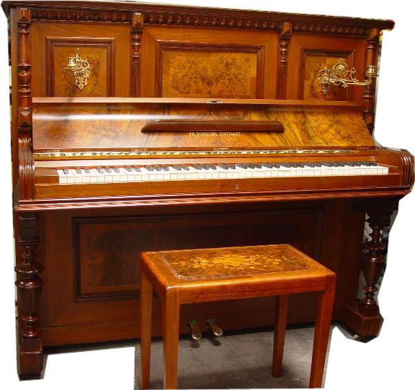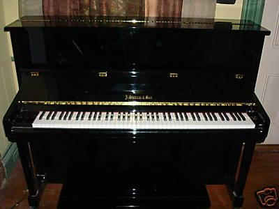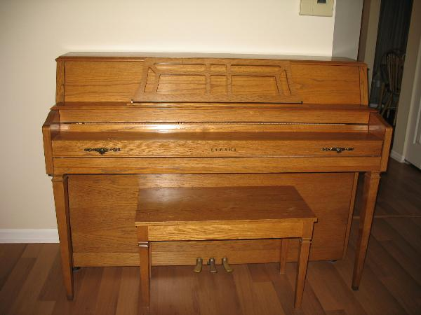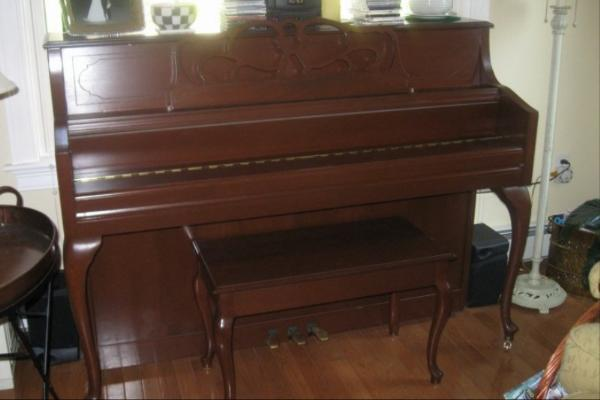 Shipment to include piano and bench. Piano has polished brown finish (not black as in picture provided) and is taller than piano in picture. It is a studio upright. Please note that the dimensions may not be exact -- I am not at the pickup location. The piano IS on casters.