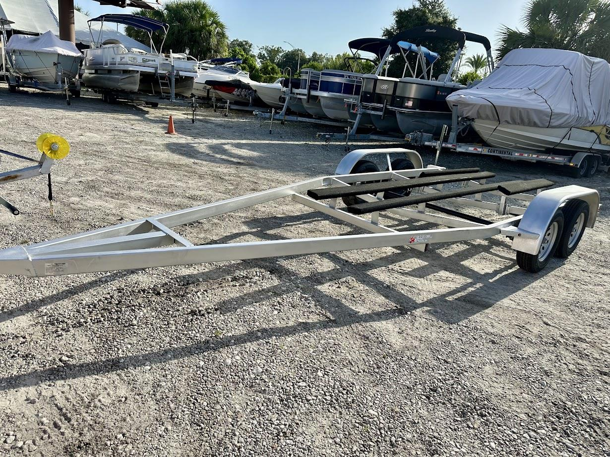 3 trailers without wheels are stacked on one trailer for transport. Transporter must supply own straps for securing the load. 12 trailer tires will travel loosely with the load.