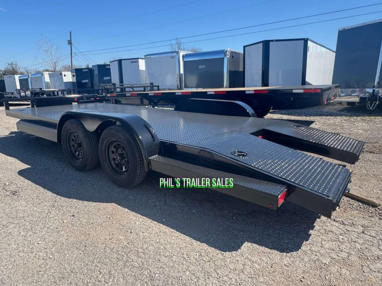 20' Car hauler with a 16' and a 14' utility trailer stacked on top. The trailers are already stacked, strapped down together and secured for transport. The stacking and securing was completed at the trailer company so it was done correctly and safely.