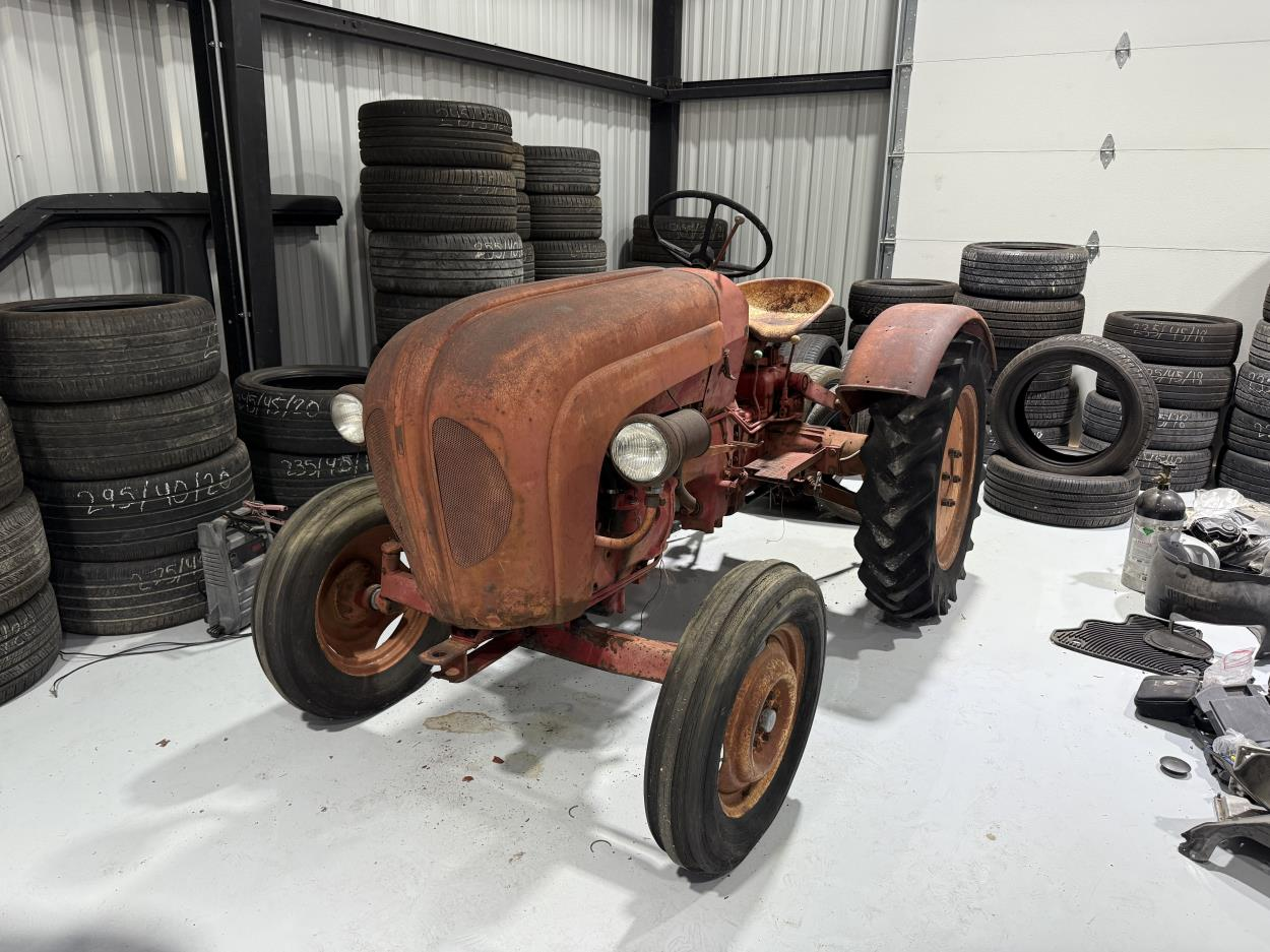 The tractor itself is only 4ft 2 inches tall but it has a roll bar which makes it 7 feet tall with that part. It has a Rototiller attached on the back.