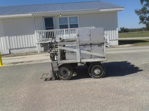 Hydraulically operated weight cart. Will contain gasoline and hydraulic fluid. Can't be fork lift loaded and unloaded but can be driven on and off truck.