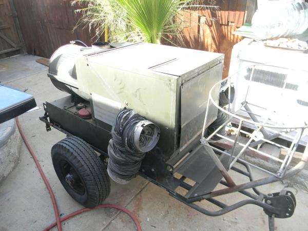 SMALL MILITARY GASOLINE FIRED DUCT HEATER. THIS MUST BE MOVED ON A TRAILER OR ON A TRUCK. THE CONDITION OF THE TIRES ARE LIKELY TO BE POOR AND NO SPARE TIRE.