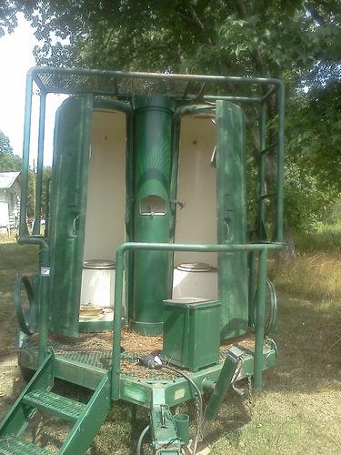 2 port-a-potties, with 3 small trash cans, one self dumping dumpster on the back. All of this built on heavy duty trailer. Trailer has a pintle hitch.