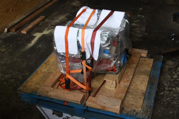 this is a new engine strapped on a pallet with sides and top...no forklift @ origin, possible pallet jack and dollies, cherrypicker onsite and 2-4 guys to help with loading...it is located at a goodyear tirecenter.they are open M-F 7-6 and Sat 7-2.