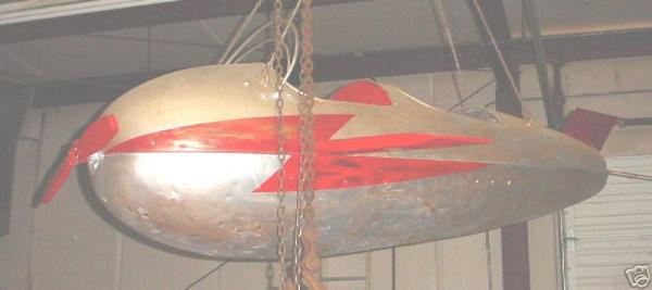 This is an old aircraft aluminum drop tank that had been converted into a kiddie ride. It had wings and a windshield, but these have been removed and placed inside the actual drop tank. Does not weigh more than 100 lbs.