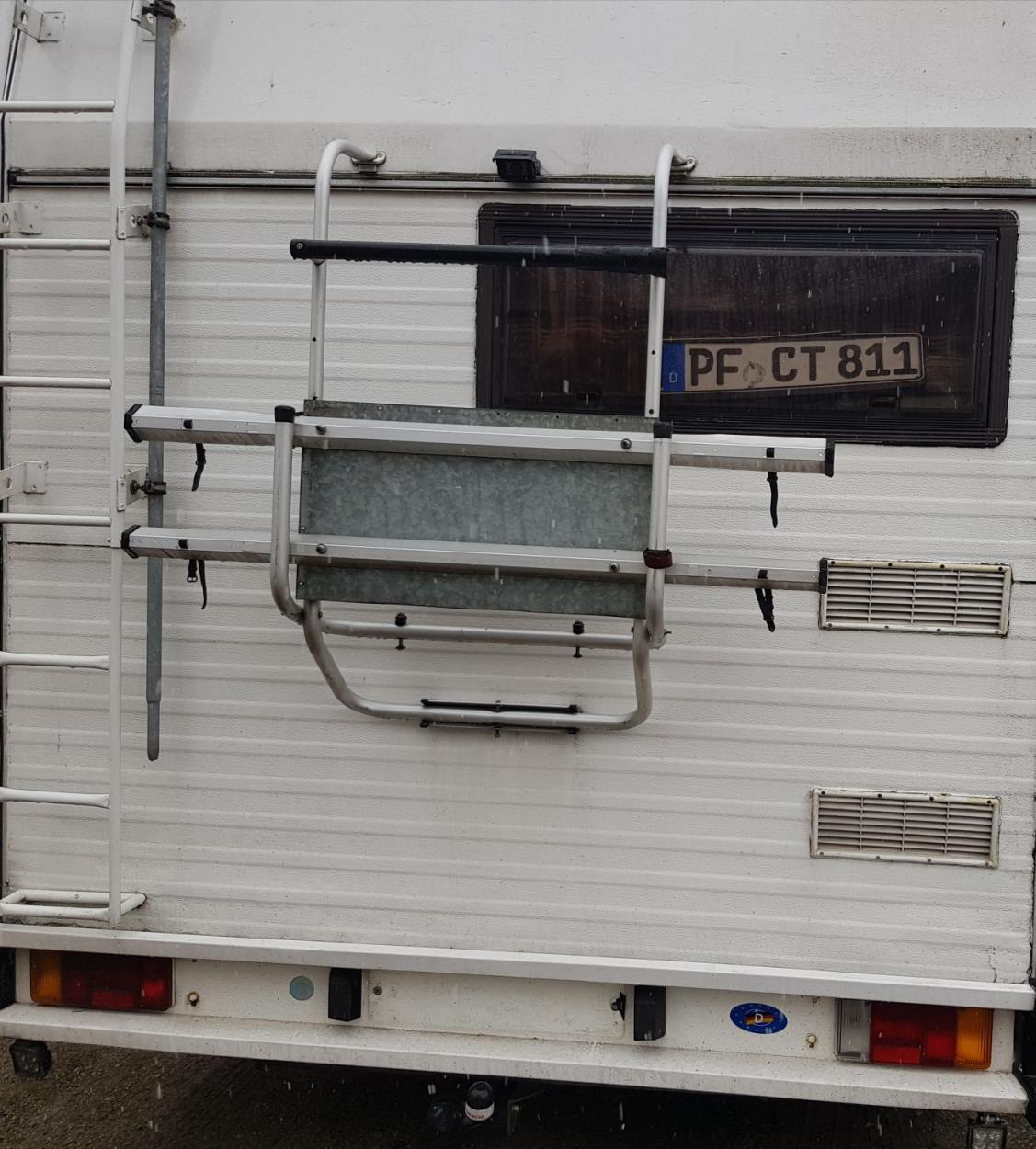 Mit Anhängerkupplung auf dem ein Fahrradträger mit zwei Fahrrädern ist.