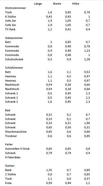 Es geht um einen Auszug. Zu transportieren wären ein Bett (1,80x2,00 m) ein auseinandergebuater Schrank, Küchengeräte und Unterschränke, 4x Vierkanthölzer (ca. 3m lang (kann auch geteilt werden wenn es nicht passt). Eine Truhe, ein paar Kisten, ein Schrank aus dem Keller. Ein alter Flipper (2 Einzelteile) 2 alte Rährenfernseher aus den 70er Jahren.