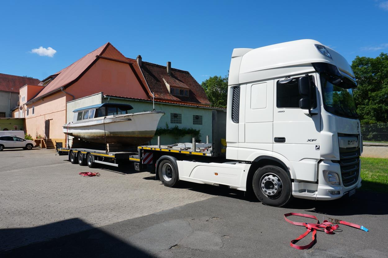 Das Pionierboot hat, wie auf den Bildern zu sehen, ein eigenes gefedertes Fahrwerk. Vor-Ort steht für die Be- und Entladung ein Traktor zur Verfügung. Der Trailer sollte dafür Auffahrrampen haben. Die angegebene Höhe und Breite ist inklusive ausgeklappten Fahrwerk. Die Länge ist ohne die Deichsel.
