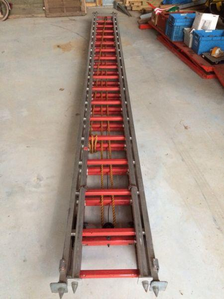Leiter unverpackt, Stützen fixiert, Spitzen gesichert. Leiter 450 cm lang (440 cm) und ca. 45 x 30 cm breit bzw. hoch. Gewicht ca.