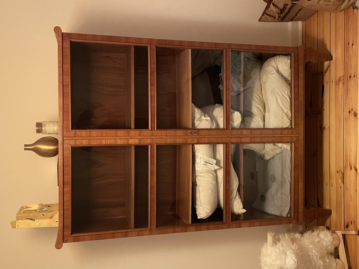 Alter stabiler Schrank aus den 1950er Jahren mit abnehmbarem Oberbau. Oberbau enthält zwei Glastüren.