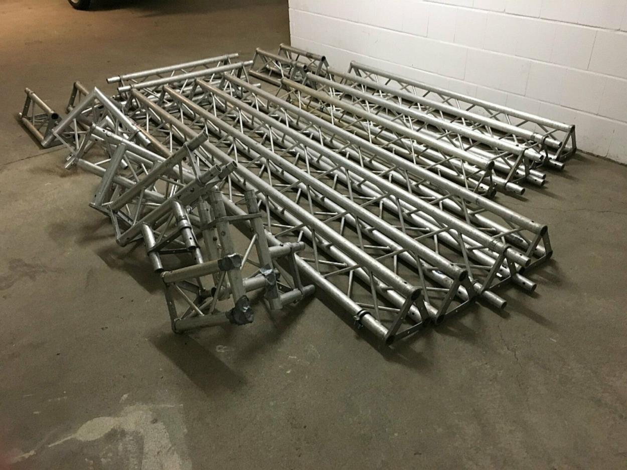 Die Streben sind Stapelbar und relativ leicht. 4 Stück sind 3m lang, 4 Stück sind 2m lang, die anderen unter 1m. Insgesamt handelt es sich um 14 Streben + 4 Ecken.
