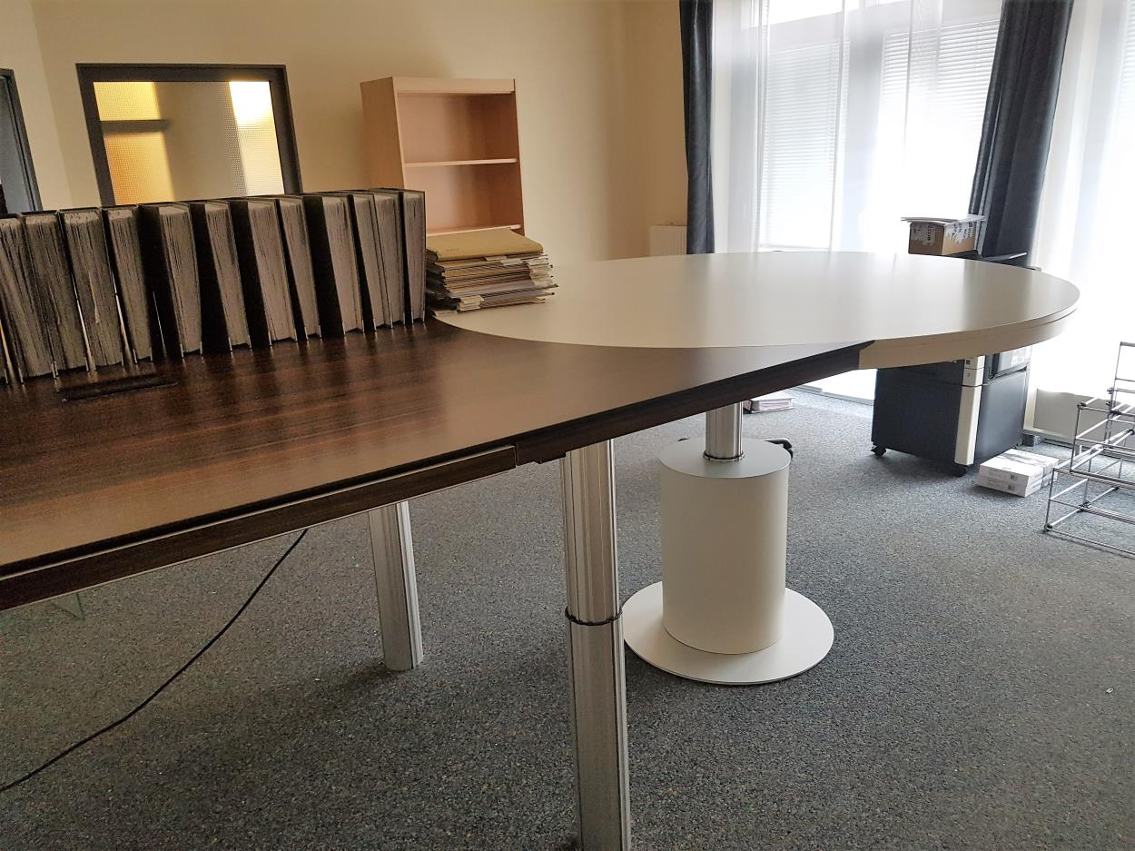 Der Schreibtisch kann auseinander genommen werden. (weiße und braune Tischfläche sind dann separat) Die Füße können abgeschraubt werden.
