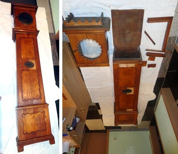 Der Uhrenkopf ist abnehmbar. Da das Uhrengehäuse unrestauriert ist, braucht man nur auf das Glas im Kopf besonders aufpassen. Sicherlich hat das Gehäuse teilweise eine flache Oberfläche, so das teilweise Objekte draufgepackt werden können?! Adresse ist nur 400 m von der BAB Abfahrt entfernt und das Gehäuse kann an der Bordsteinkante des Innenhofes abgestellt werden. Kein Zeitdruck!